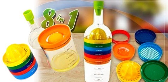 В каждой кухне имеется очень много разнообразных предметов, которым иногда не хватает места, проблема решаема - с помощью бутылки, которая заменит целых восемь предметов: терку для сыра и чеснока, соковыжималку, открывалку, удобный отделитель для желтка, воронку, измельчитель для яиц и традиционный мерный стакан.