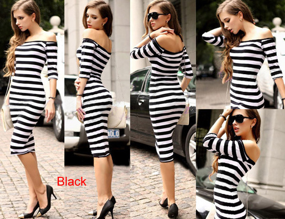 Трикотажное платье с открытыми плечами и прилегающим силуэтом. Оно хорошо садится и подчеркивает стройную фигуру.