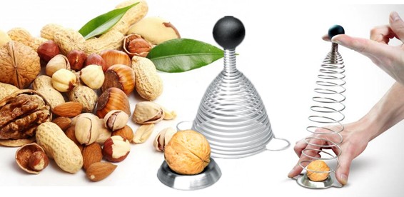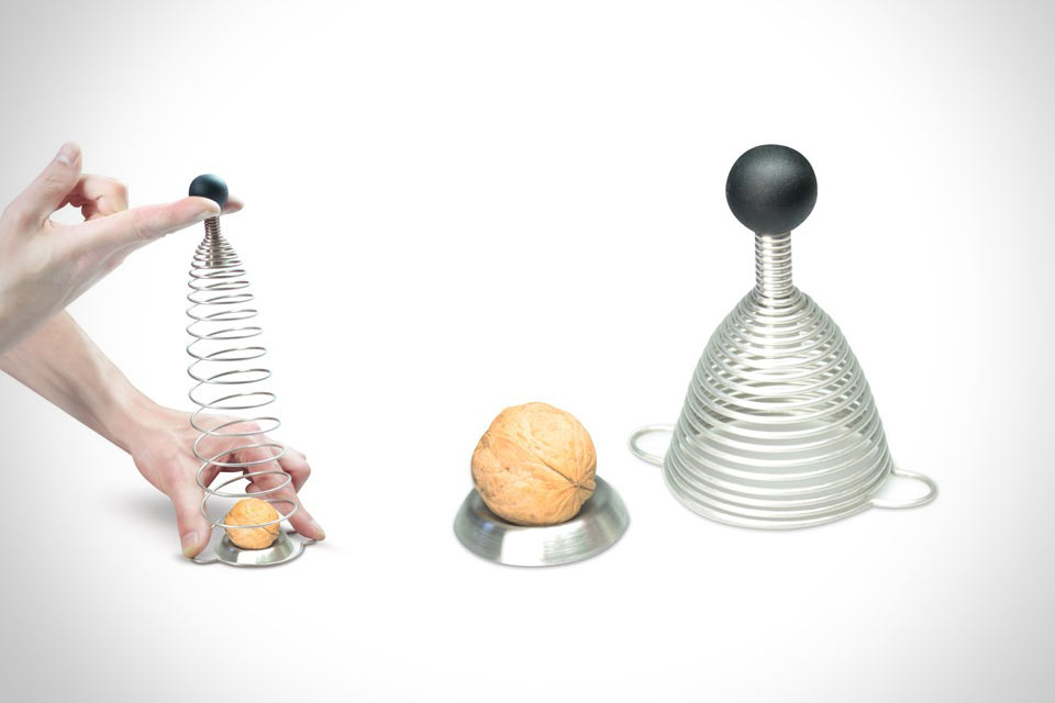 Пружинный орехокол легко расколет любой орешек, не повредив ядро. Кладём на металлическую подставочку орех, накрываем верхней частью и, придерживая её пальцами за выступы, оттягиваем пружину с бойком. Секунда — и вот скорлупа отдельно, а ядро отдельно.
