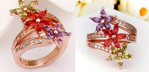 Изящное позолоченное кольцо 18К с разноцветными цветами. Необычное дизайнерское решение для Вашего неповторимого стиля.