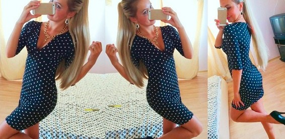 Платье имеет застёжку по спинке на потайную молнию, рукав три четверти и глубокий вырез.