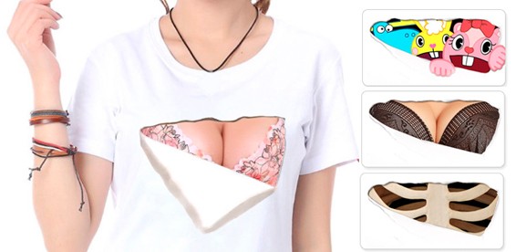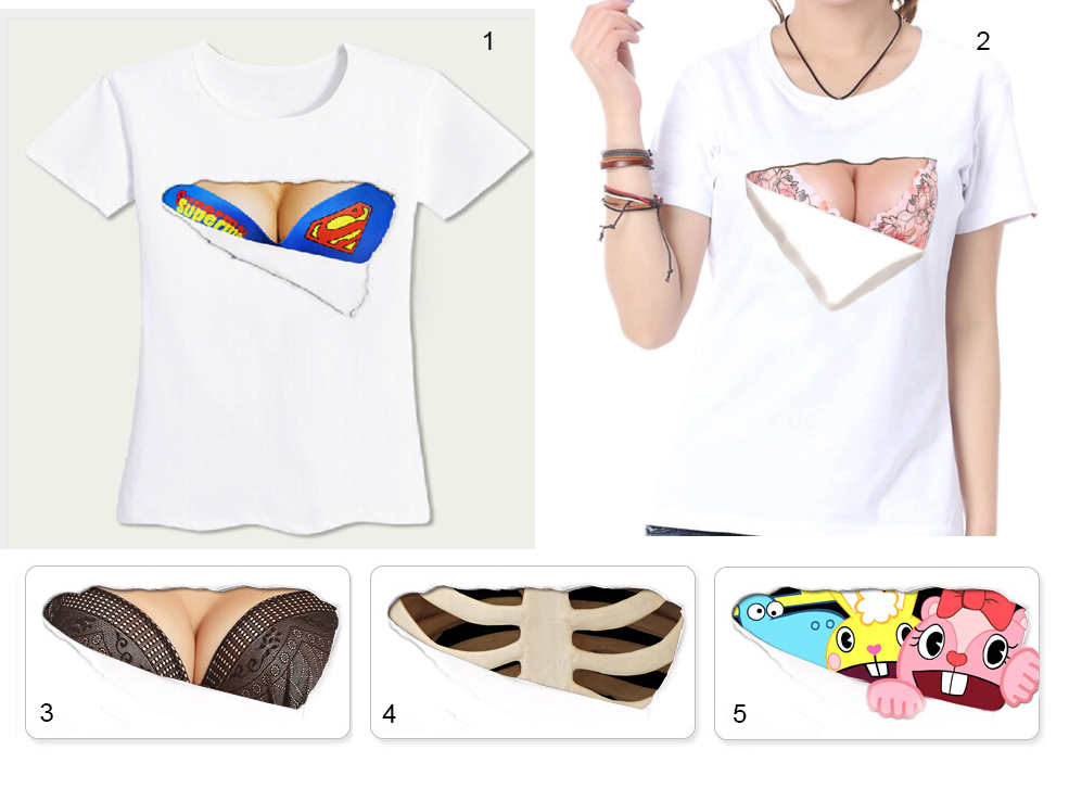 Оригинальная футболка с 3D принтом женской груди в чёрном или розовом бюстгальтере, героями мультсериала "Happy tree friends", "Superman" и рёбрами.