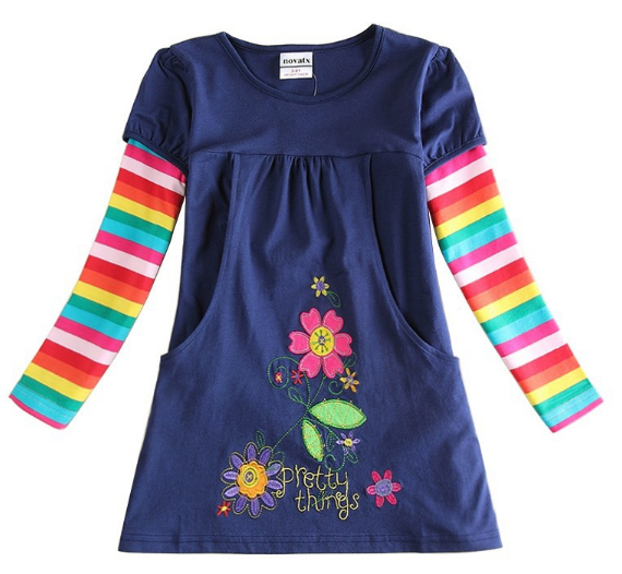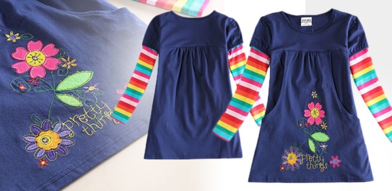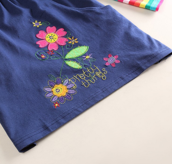 Трикотажное детское платье с вышивкой на подоле. Оно удобное и хорошо садиться по фигуре. Спереди и сзади - сборка по кокетке, рукав с имитацией двойного.
