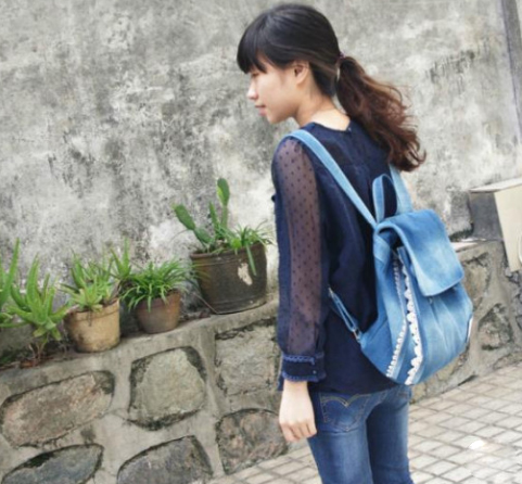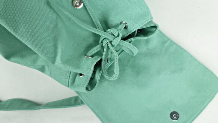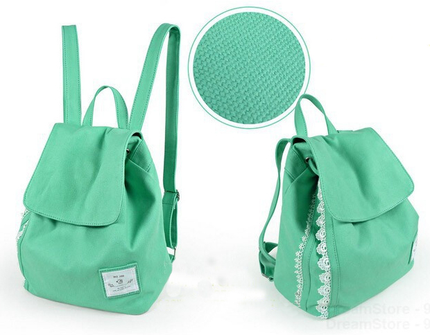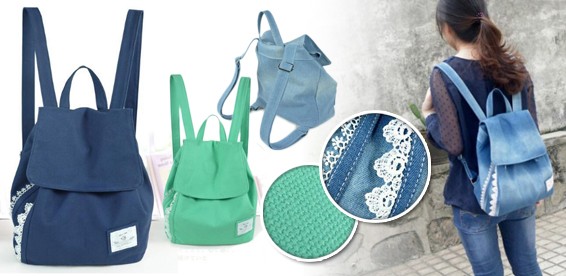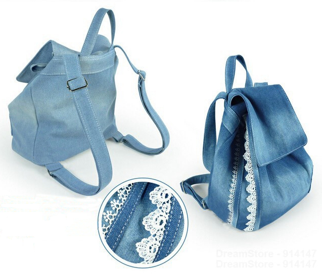 Рюкзак из ткани и с кружевными вставками сбоку. Он очень вместительный, имеет внутри одно большое отделение и несколько небольших карманов. Вверху рюкзак застёгивается на магнит и затягивается на шнур.