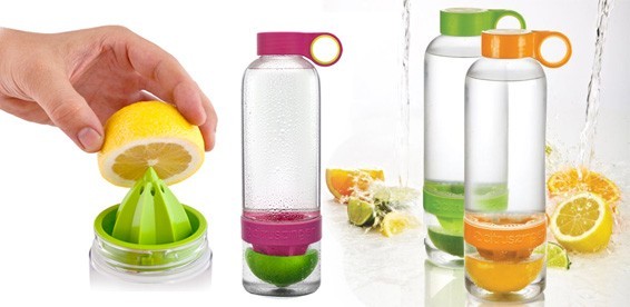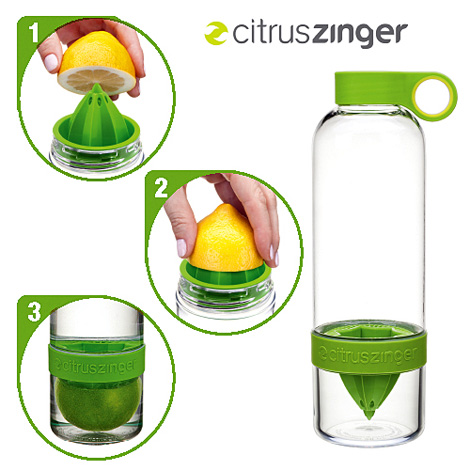 Citrus Zinger – это многофункциональная бутылочка с соковыжималкой для быстрого приготовления и употребления прохладительных напитков. Она состоит из двух модулей: завинчивающейся соковыжималки для цитрусовых и емкости с пластиковой крышкой. Сначала необходимо взять разрезанный напополам лимон, лайм, апельсин или мандарин среднего размера и выжать его в перевернутую бутылочку емкостью 800 мл, снабженную удобной ручкой, придающей ей устойчивость. Затем в бутылку заливается холодная вода и немного льда. После легкого встряхивания напиток готов к употреблению.