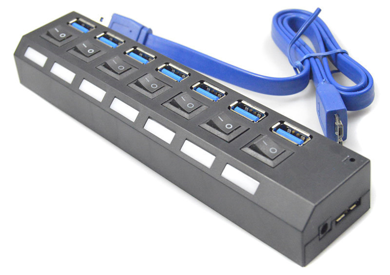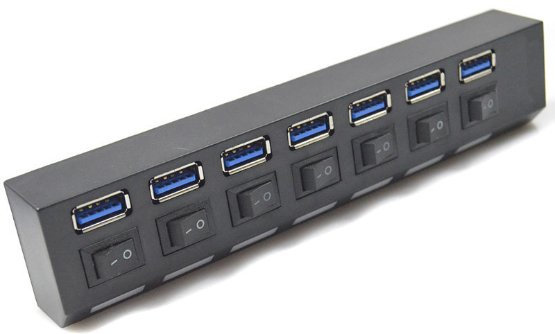 Данный USB-разветвитель имеет 7 портов, каждый из которых имеет отдельный выключатель с подсветкой.