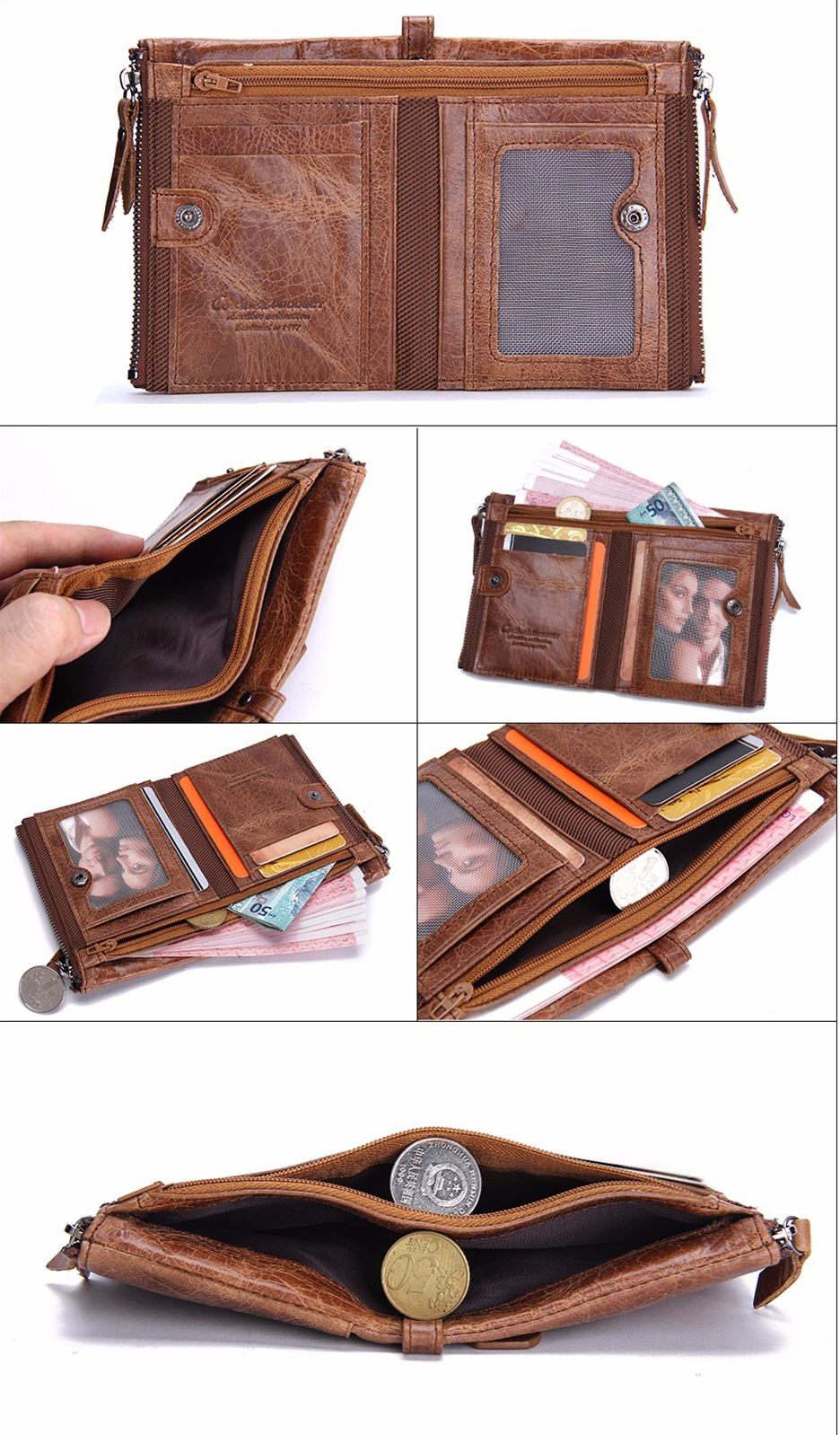 Данный кошелёк из натуральной кожи имеет еще одну особенность он состоит из двух половинок и раскрывается по принципу книжки, имеются карманы для мелочи на молнии, а застёжка в виде заклёпки позволяет закрыть основной отдел бумажника.