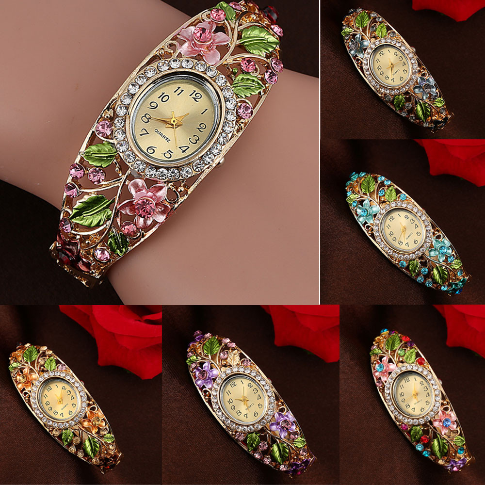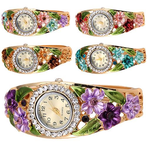 Модный браслет-часы имеет большой красивый цветущий цветок с блестящим горным хрусталем, круглый циферблат.