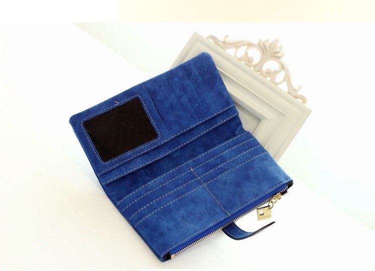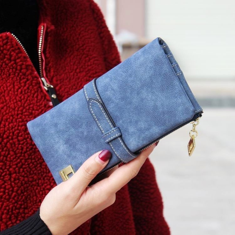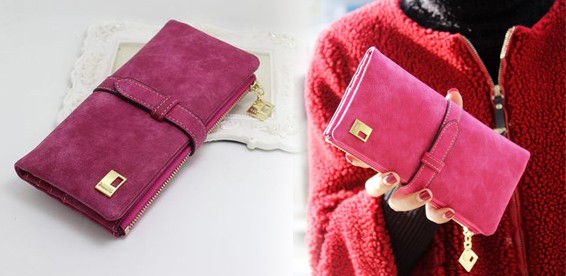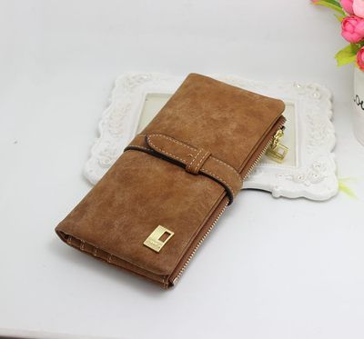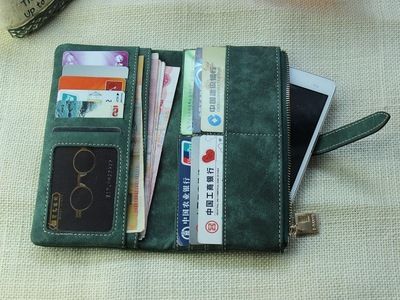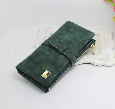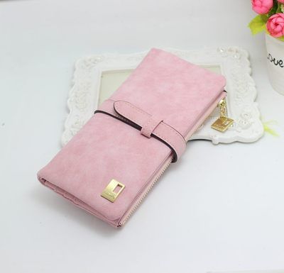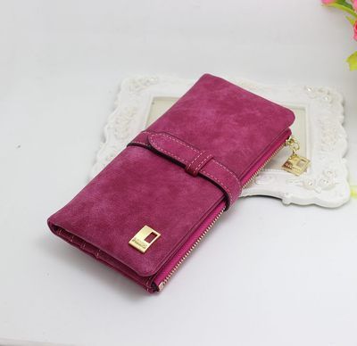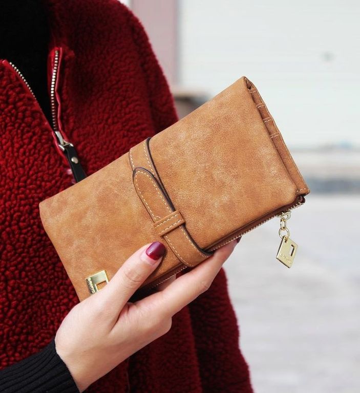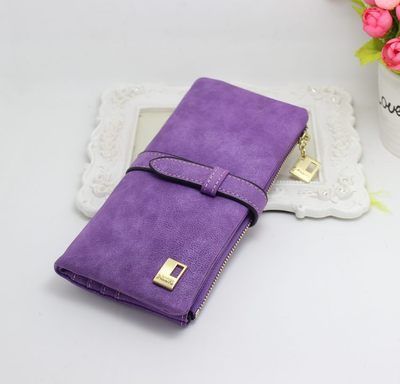 Женский кошелек-бумажник из искусственной мягкой матовой кожи, закрывается хлястиком. Имеет отделения для карточек и фото, отделение на молнии для денег, телефона. Размеры: 18,5 см*9 см. Производство - Китай.