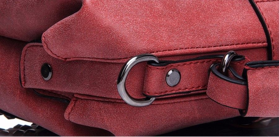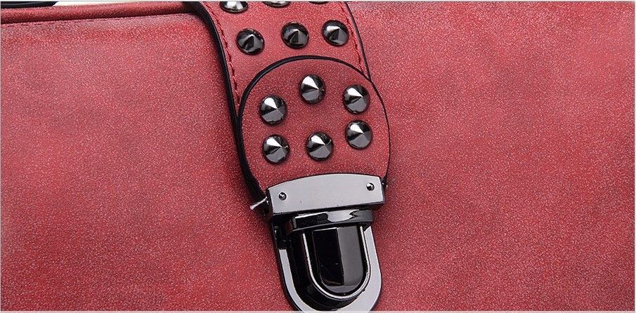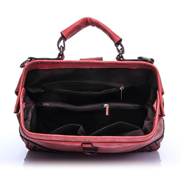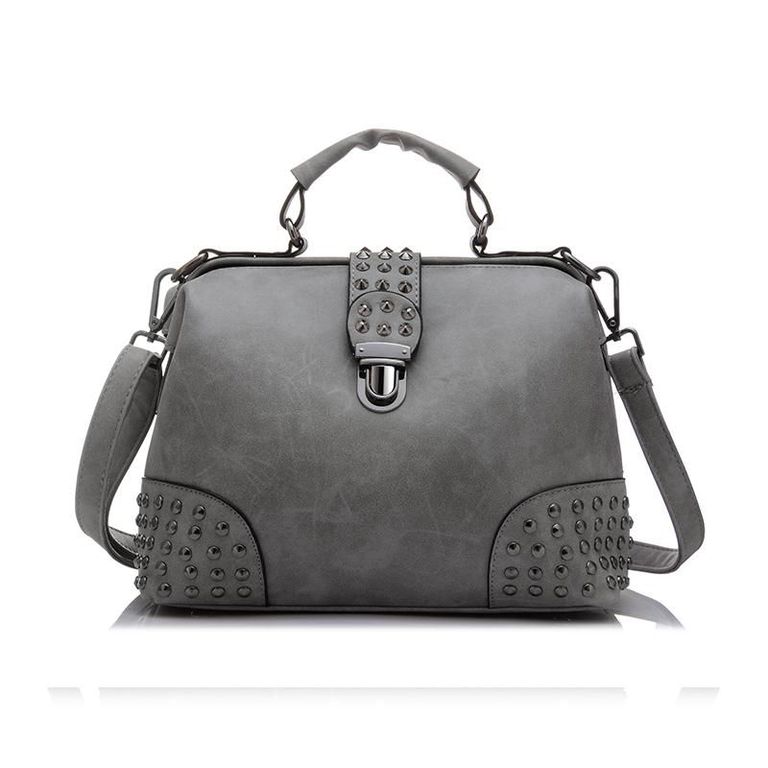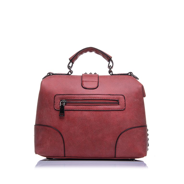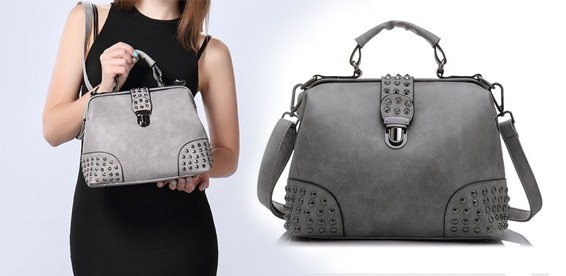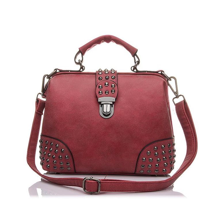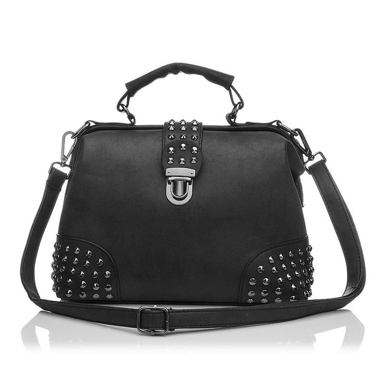 Женская сумка-саквояж из искусственной кожи с металлическими шипами. Застегивается хлястиком с защелкой "язычок". Имеет внутренние карманы и съемный регулируемый плечевой ремень. Размеры: длина - 27 см, ширина - 12 см, высота - 20 см. Производство - Китай.