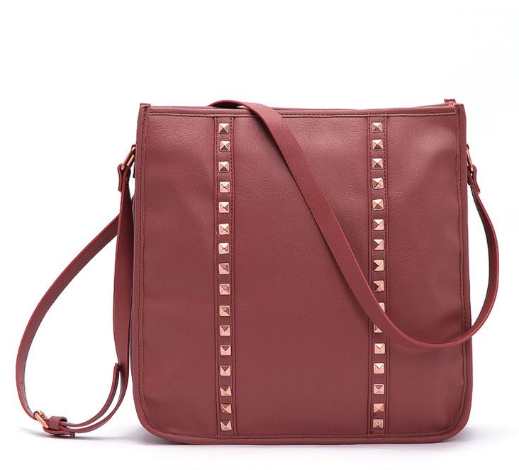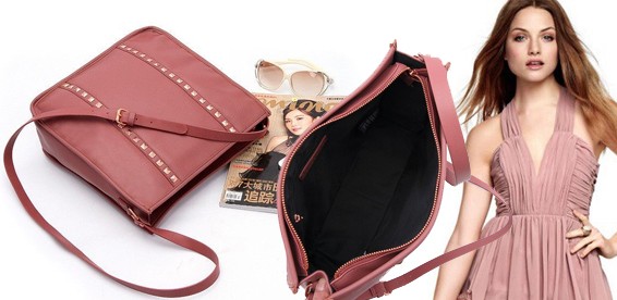 Женская сумка цвета пыльной розы из мягкой искусственной кожи. Украшена металлическими заклепками, имеет регулируемый ремень. Застегивается на молнию. Размеры: длина - 32 см, ширина - 12 см, высота - 31 см. Производство - Китай.