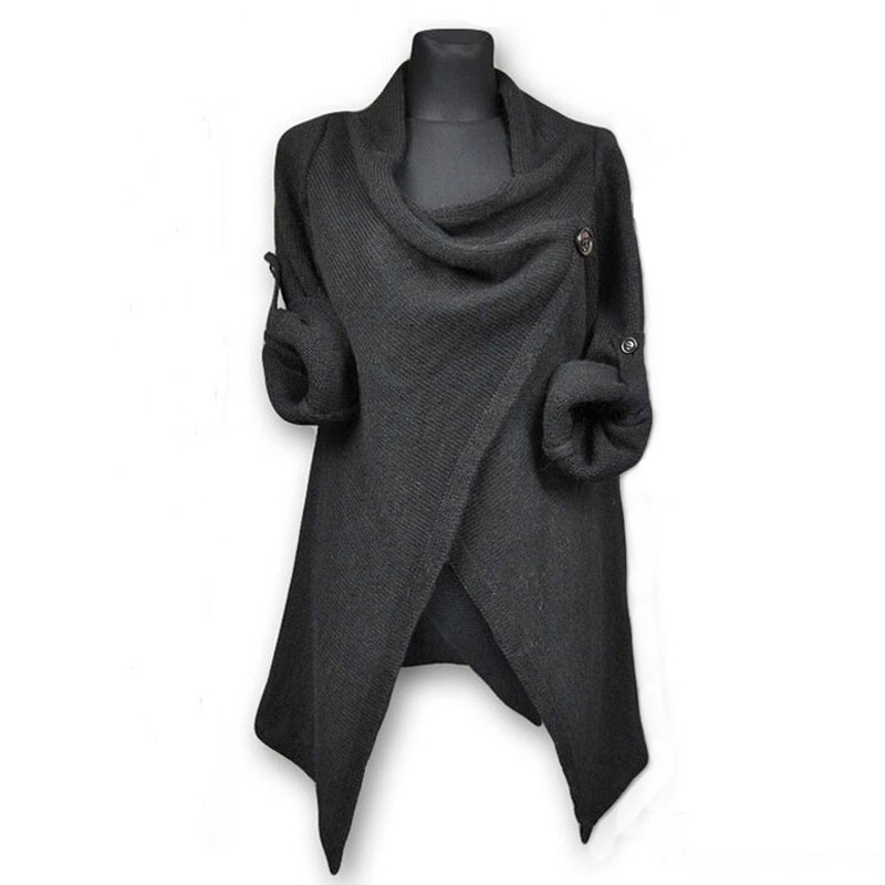 Удобный и стильный кардиган-пончо с длинными рукавами. Особенно выигрышно он будет смотреться с очень узкими джинсами. В ассортименте разные цвета (чёрный, серый, синий и бежевый). Застегивается кардиган на пуговицу.