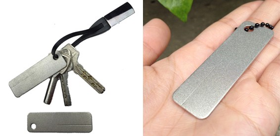 Комплектация — пластина и цепочка. На точилке есть отверстие, которое позволяет носить ее разными способами, помимо стандартного ношения на цепочке, например как брелок для ключей.