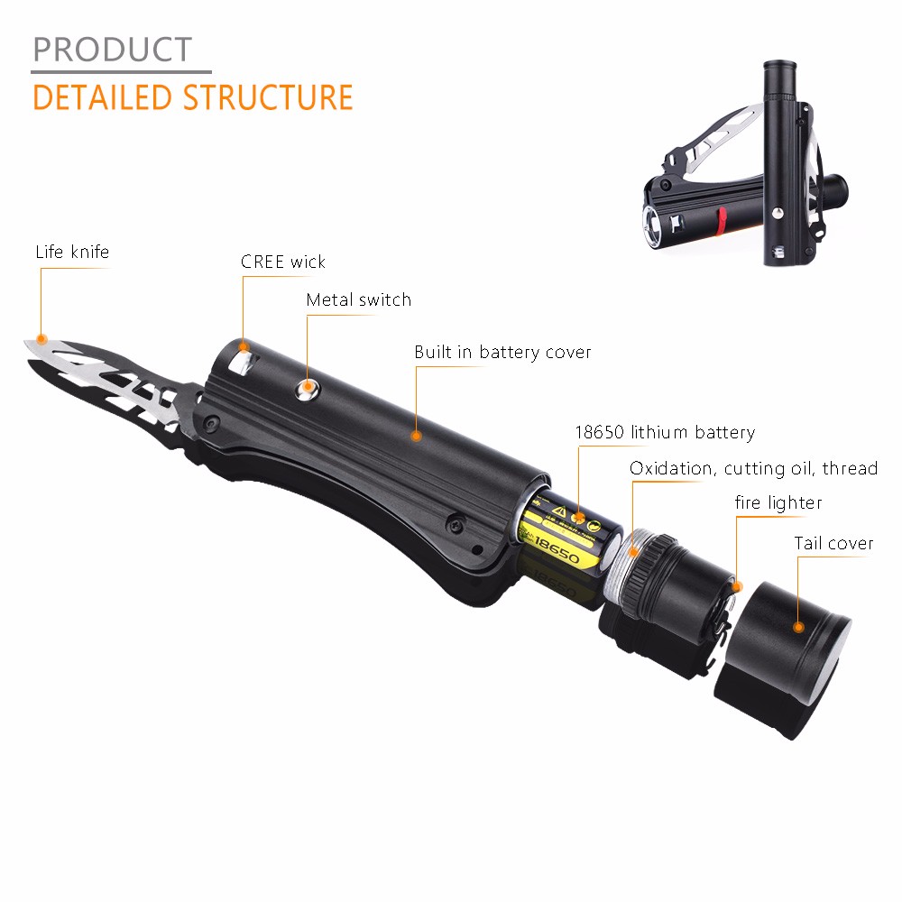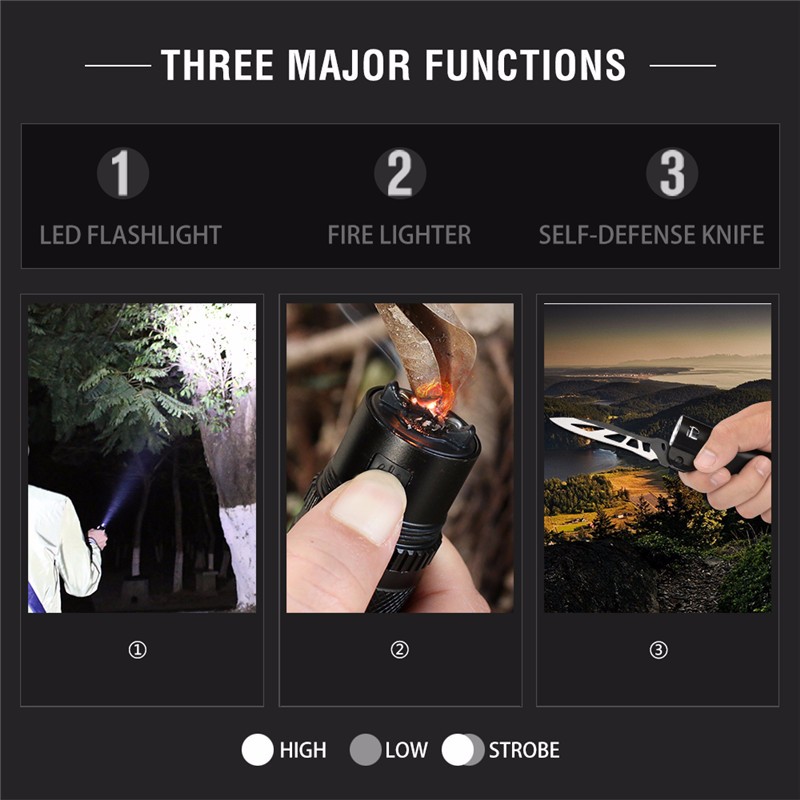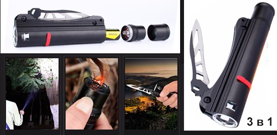 Этот светодиодный фонарик с ножом и зажигалкой. Он идеально подходит для кемпинга, туризма, выживания, спелеологии и в любых чрезвычайных ситуациях. В любое время, везде, он никогда не подведет вас.
