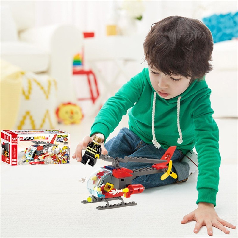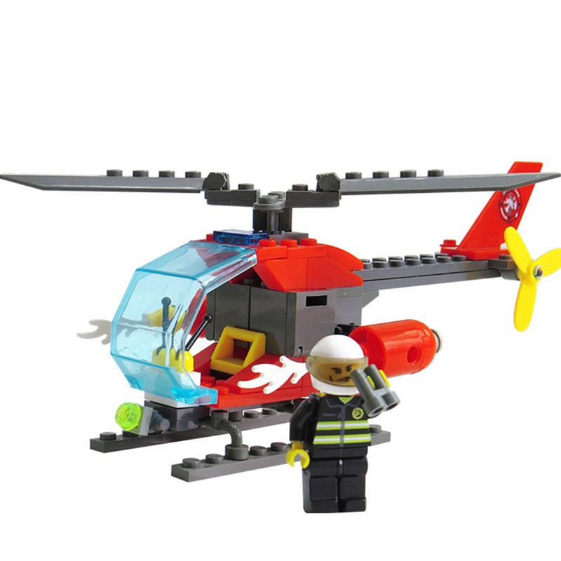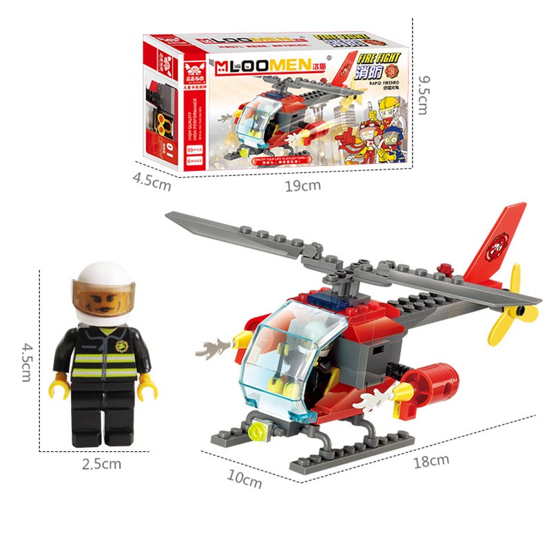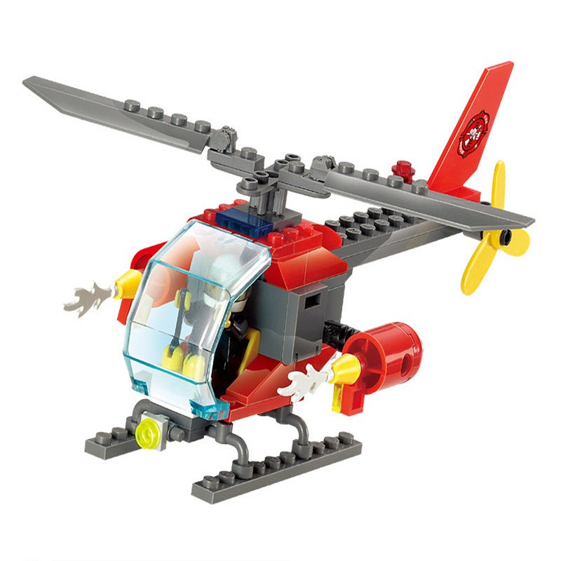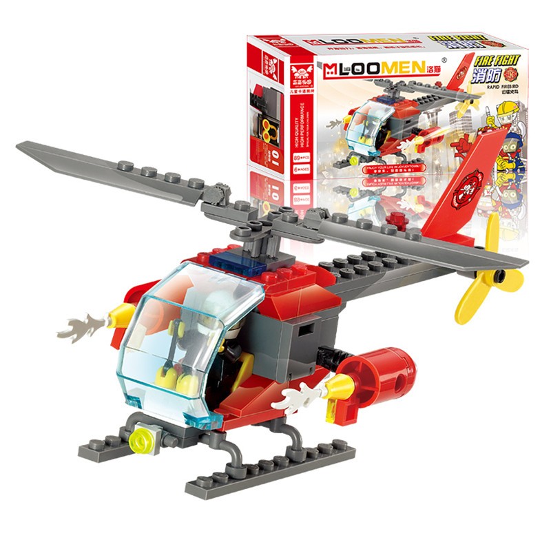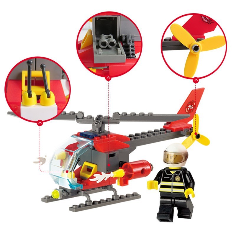- Соединив их в правильном порядке, ребёнок получает модель вертолёта пожарной службы с кабиной пилота и фигуркой пожарника, что позволяет придумать много новых сюжетов для игр.