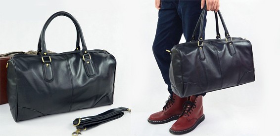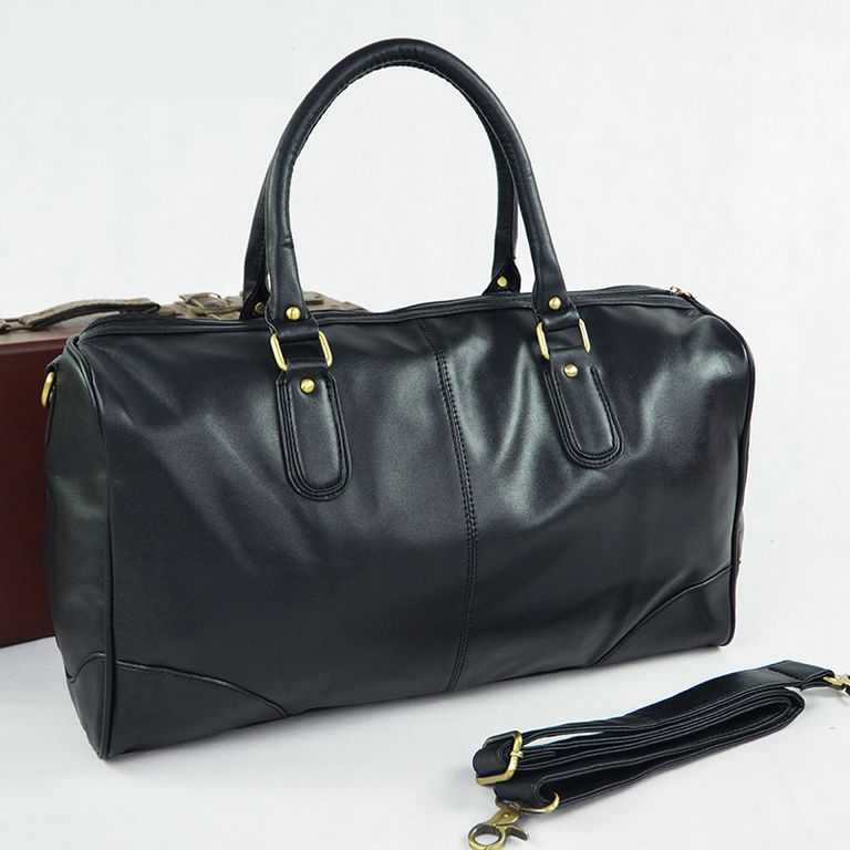 Мужская черная дорожная сумка из искусственной кожи. Застегивается на молнию, имеет внутренние карманы, отстегивающийся плечевой ремень. Размеры: длина - 44 см, ширина - 13 см, высота - 31 см. Производство - Китай.