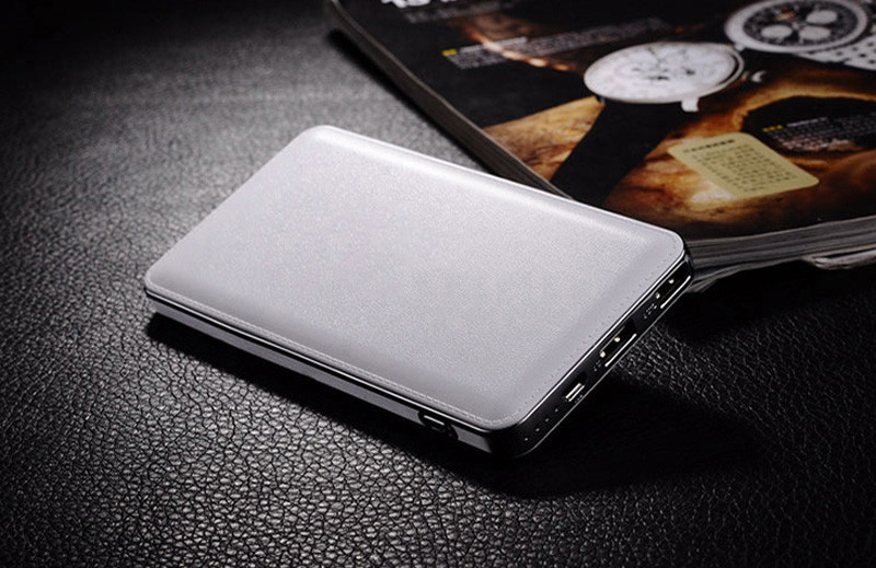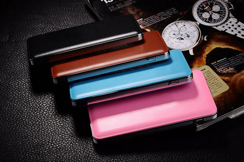 Компактный Powerbank на 12 000 мАч стилизованный под кожаный бумажник с двумя портами USB и индикатор питания.