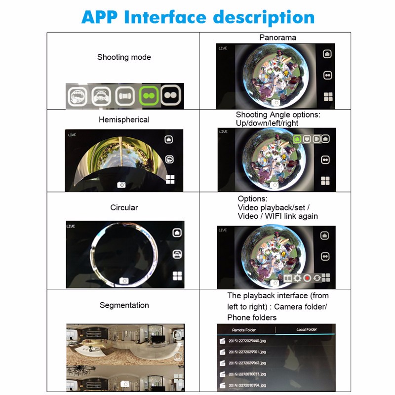 Полусферический, циркулярный, сегментация и запись панорамы 4 режима, Контролируемые смартфоны через Wi-Fi
