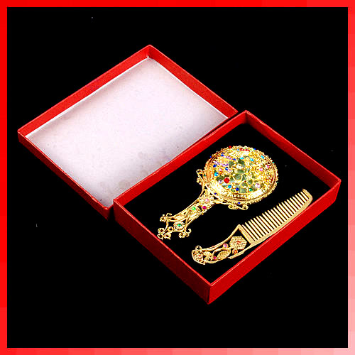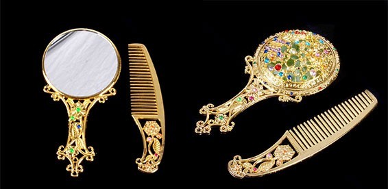 Набор представляет собой зеркало на ножке со стразами и расческу с редкими зубьями, которые упакованы в красивую подарочную коробочку.
