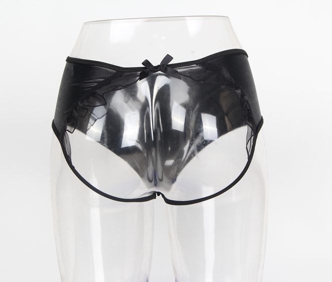 Соблазнительные кожаные трусики в чёрном цвете. Модель трусиков с открытой попкой. Украшает их сзади кружево и бантик.