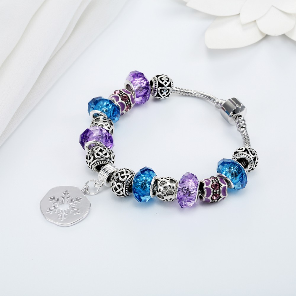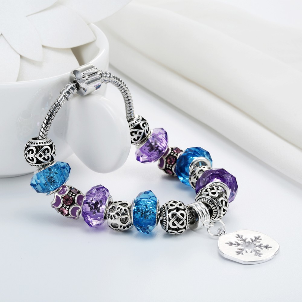 Зимний браслет со снежинками собран в голубовато-фиолетовой гамме. Браслет украшен бусинами из муранского стекла ручной работы, шармами с синими стразами, фигуркой в виде снежинки.