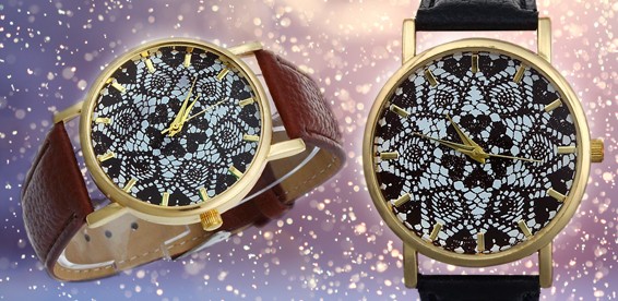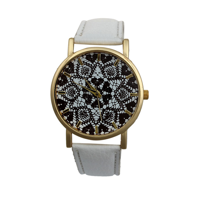 Наручные часы оснащены кварцевым механизмом с часовой, минутной и секундной стрелками. Ремешок выполнен из PU кожи чёрного, белого, коричневого и бежевого цвета, корпус изготовлен из стали с золотистым покрытием. Циферблат оформлен изображением кружева.