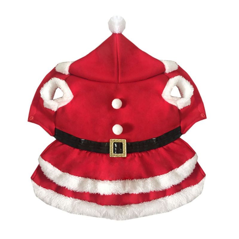 Новогодний костюм для собак сделан из мягкой ткани в классическом красном цвете с белыми оборочками из искусственного меха. В комплекте прелестная шапочка с милым помпоном.