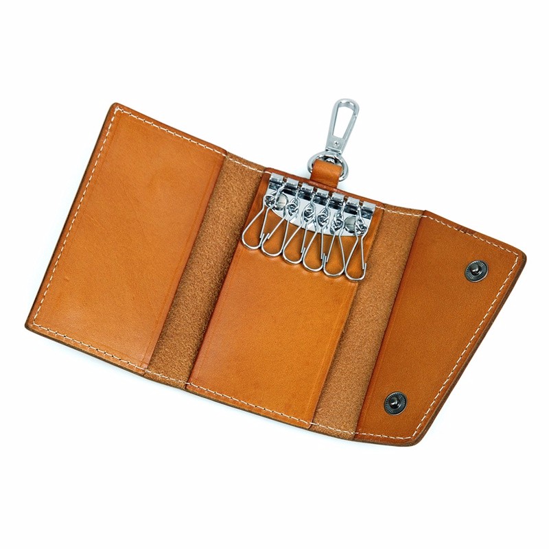 Ключница выполнена из натуральной гладкой кожи. Изделие закрывается с помощью кнопок. Внутри расположена металлическая панель с шестью фиксаторами для ключей. Ключница оснащена замком-карабином, с помощью которого изделие можно фиксировать на одежду.