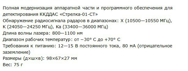 Улавливает все виды лазеров и радаров, работает в двух городских режимах в восьми диапазонах + "ловит" сигнал с комплекса Стрелка.