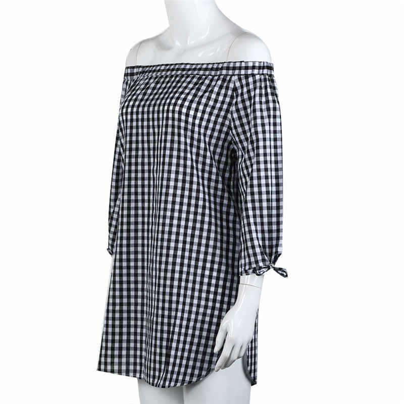 Платье укороченное, с объемными рукавами три четверти и открытыми плечами. Фасон платья свободный, что позволяет скрыть мелкие недостатки фигуры. Платье можно носить как с однотонными леггинсами или шортами, так и с зауженными брюками.
