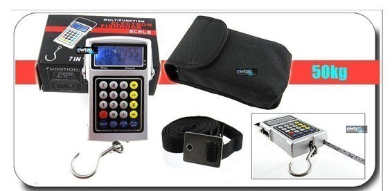 Многофункциональный безмен с калькулятором - часы, термометр (град. Цельсия), 7-разрядный калькулятор, рулетка 1 м. Электронный безмен имеет функцию автоматического расчета цены в зависимости от измеренного веса. Функция тары, автоматическое сохранение веса/ручное сохранение. В комплект входит специальный ремень для взвешивания габаритных грузов (до 1,8 м в диаметре).