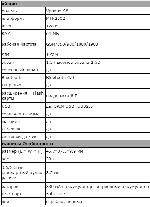 На задней панели расположен датчик сердечного ритма, также гаджет умеет считать шаги. Vphone S8 заключен в алюминиевый корпус оснащается 1,54-дюймовым тачскрином с 2.5D-стеклом со скругленными кромками. Аппаратной основой стал MTK2502, 64 МБ оперативной и 128 МБ встроенной флеш-памяти. Сам по себе он рассчитан на одну SIM-карту и GSM-связь в частотах 850/900/1800/1900 МГц. Поддерживаются Bluetooth 4.0 и FM-радио. Аккумулятор обладает емкостью 380 мАч. Предусмотрен порт USB 2.0 и 3,5-мм мини-джек. Размеры составляют 46,7 х 37,3 х 9,9 мм, а вес — всего 30 граммов.