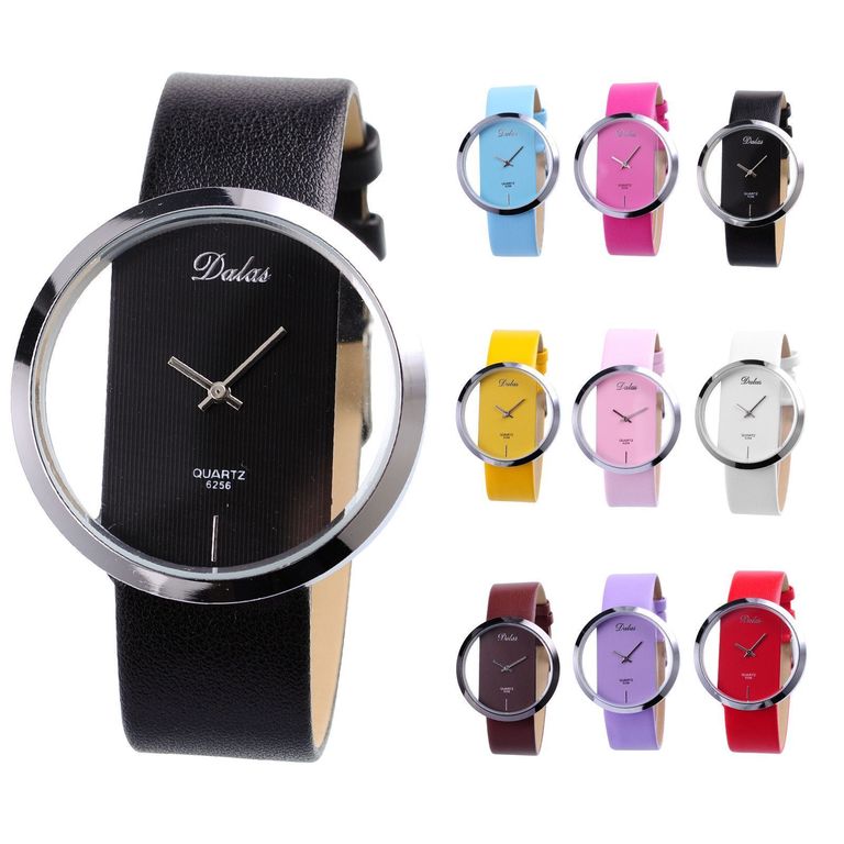 Женские кварцевые часы Dalas 6256 транспарантные, на регулируемом ремешке из качественной искусственной кожи, длинной 23 см. Имеют корпус из нержавеющей стали диаметром 4,2 см и шириной 0,8 см, аналоговый дисплей без цифр. Отлично подойдут в качестве подарка.