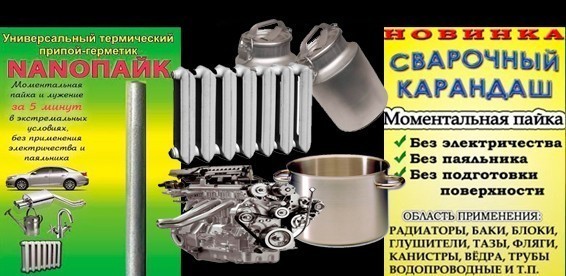 - деталей в сантехнике: водопроводных труб, радиаторов, различных соединений; и так далее...Новая технология пришлась по душе не только простым людям имеющим автомобиль, хозяйство, дачу, но и специалистам автосервиса, сантехникам. Они оценили возможности паяльного карандаша "Нанопайк" в деле. В связи с этим он все больше набирает популярность!Вы уверены в том, что у Вас никогда не потечёт радиатор в автомобиле или трубы отопления? Не прохудится ведро на даче или кровля? Мы с уверенностью можем сказать, что c паяльным карандашом "Нанопайк", Вы устраните проблему в кротчайшие сроки, в экстримальных условиях, не используя электричества и паяльника. А лишь при помощи спичек или зажигалки и конечно же карандаша "Нанопайк". Область применения: автомобиль (радиаторы, баки, блоки, глушители, поддоны); дом, квартира, сад (водопроводные трубы, радиаторы, вёдра, баки, бидоны, тазы, фляги, кастрюли и любые другие алюминиевые, чугунные, медные емкости, дерево, фарфор, керамика, кровля).