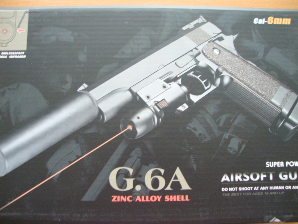 Модель пистолета G.6A Colt 1911 PD с глушителем и лазерным прицелом (Galaxy) (пневматика, металл+пластик).