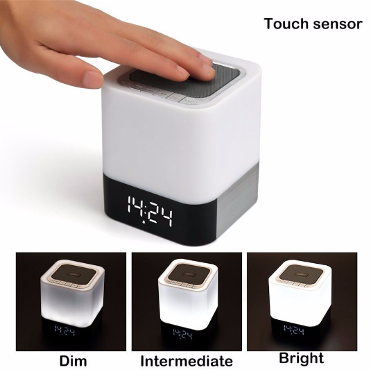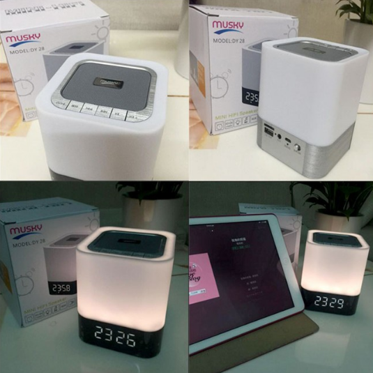 Колонка Musky оснащена яркой подсветкой, легким прикосновением на колонку сверху включается свет и с последующими прикосновениями яркость света уменьшается или повышается. Встроенные электронные часы с функцией будильника.