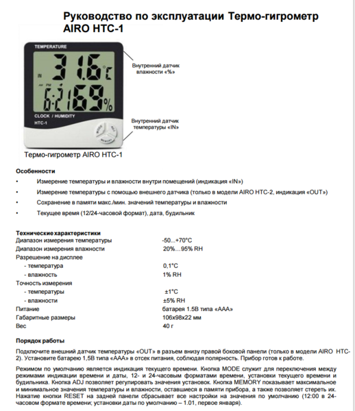 Современный электронный термометр (градусник) с часами, будильником, календарём, гигрометром. Электронный мультифункциональный термометр HTC-1 достаточно прост и безопасен для использования. Гигрометр НТС-1 создан для измерения относительной влажности воздуха и его температуры. Применяется это устройство обыкновенными потребителями в различных жилых помещениях. Также возможно использование прибора в офисах и на производствах. Его применяют для снятия показаний, а также для проведения контроля и (при необходимости) изменения влажности воздуха или его температуры.