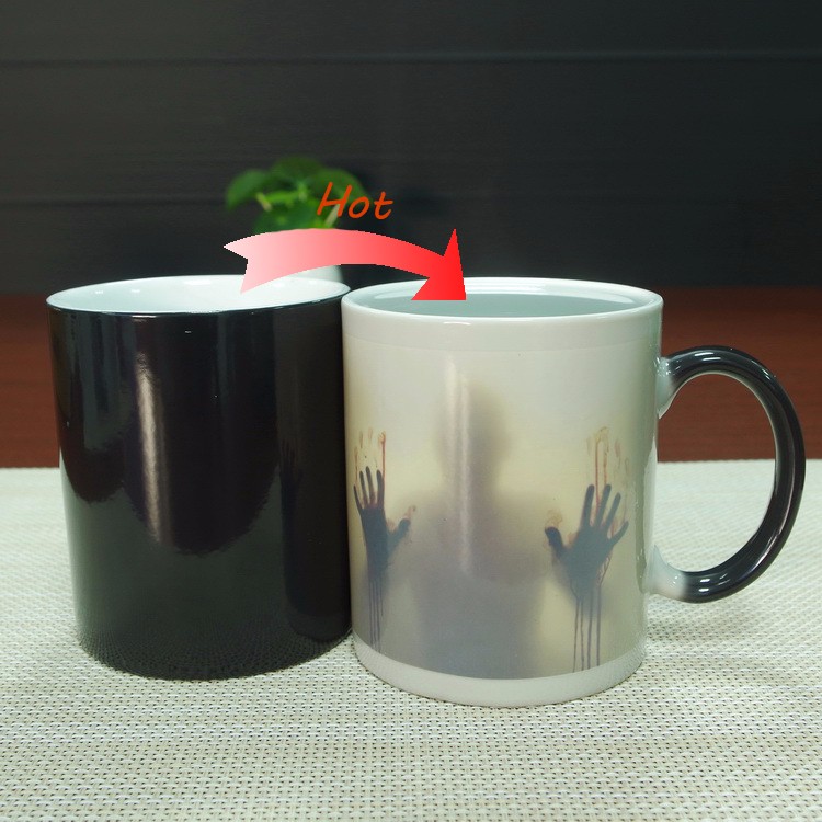 Керамическая кружка хамелеон ходячие мертвецы "The Walking Dead". Изменяет цвет при нагреве. В холодном состоянии кружка черного цвета Если в нее налить горячий напиток, то наружная часть меняет цвет с темного на светлый, а на светлом поле проявляется рисунок.
