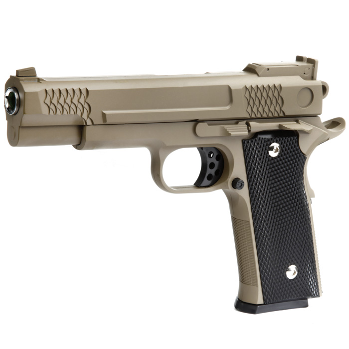 Копия идентичная Browning 1935г, который был на вооружении многих стран во время Второй Мировой Войны. Корпус песочного цвета сделан из цинкового сплава. Рукоятка имеет черные пластиковые вставки с геометрическим узором. На стволе есть декоративная стальная чешуя. В руке не скользит. Ствол холодный на ощупь. За счет тугих пружин и металлической обоймы на 14 пластиковых пуль.