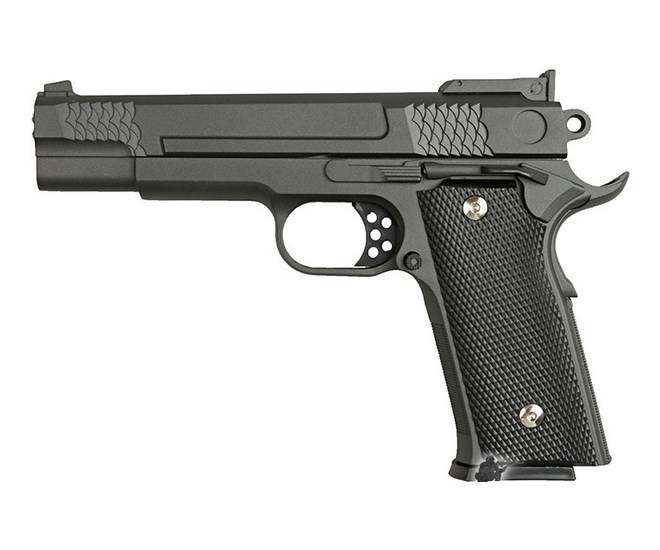 Модель идентичная культовому Browning, который участвовал во Второй Мировой Войне. Классический черный цвет корпуса сделан из цинкового сплава. Тяжелый и мощный за счет тугих пружин и металлической обоймы на 14 пластиковых пуль. Стреляет со скоростью 95м/с. Пробивает насквозь алюминиевую банку при выстреле в упор. Не имеет предохранителя. При плохом освещении может сойти за боевой.