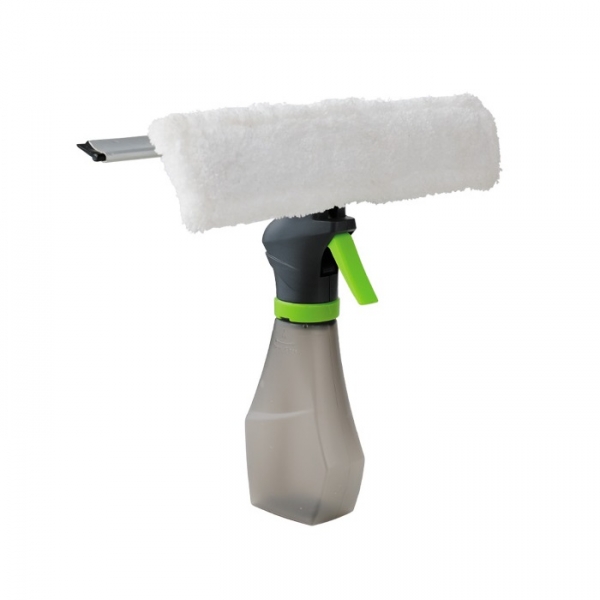 В колбу вы наливаете жидкость для мытья окон или мыльный раствор, распрыскиваете на стекло, тщательно отмываете загрязнения насадкой из микрофибры, а остатки жидкости и потеки сметаете водосгоном к бортикам рамы. За 5 минут у вас чистейшее стекло!