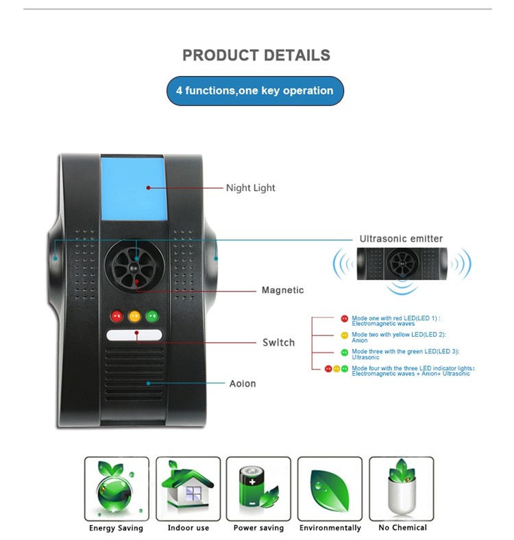 Многофункциональный ультразвуковой отпугиватель насекомых,грызунов и других вредителей нового поколения. Электромагнитные Волны + Анион + Ультразвук + ночник!