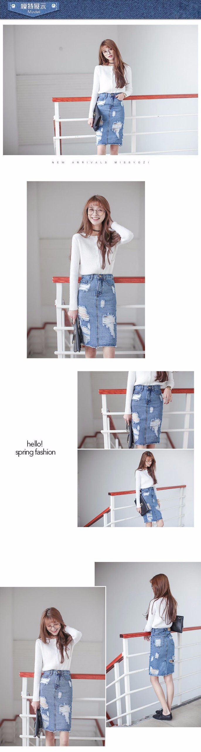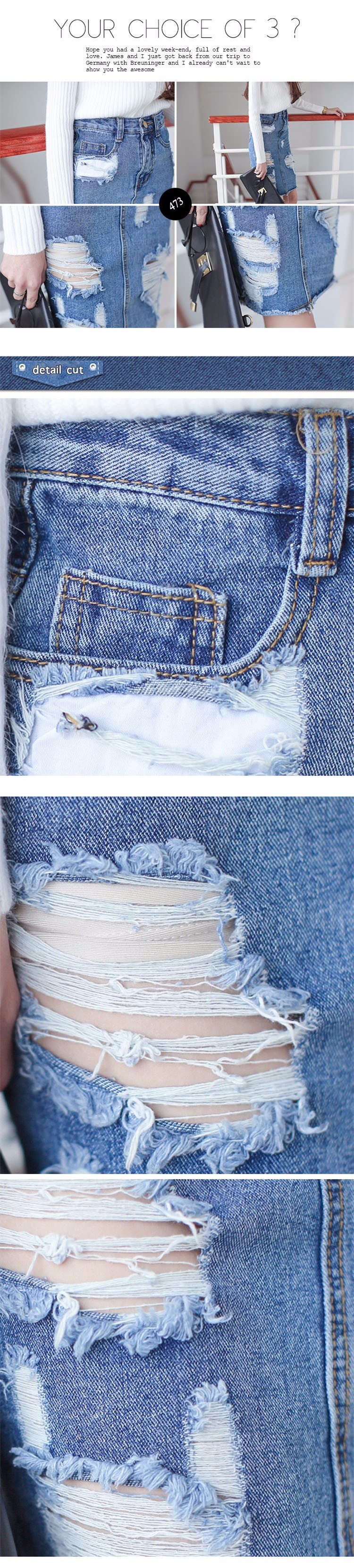 Для создания джинсовой юбки средней длины использован синий плотный хлопок с потертостями. Советуем сочетать с футболкой и ботильонами черного цвета.