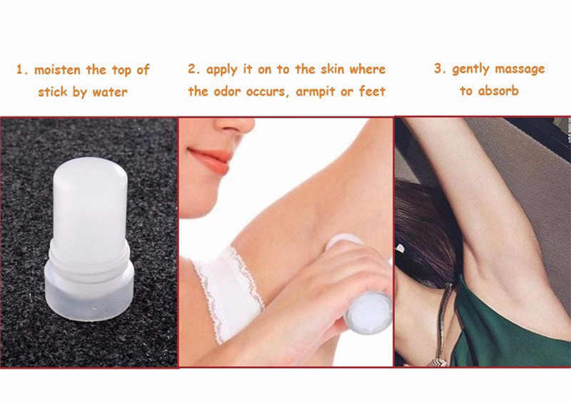Перед использованием кристалл нужно намочить, после чего протереть им подмышки, также как вы сделали бы это шариковым дезодорантом.