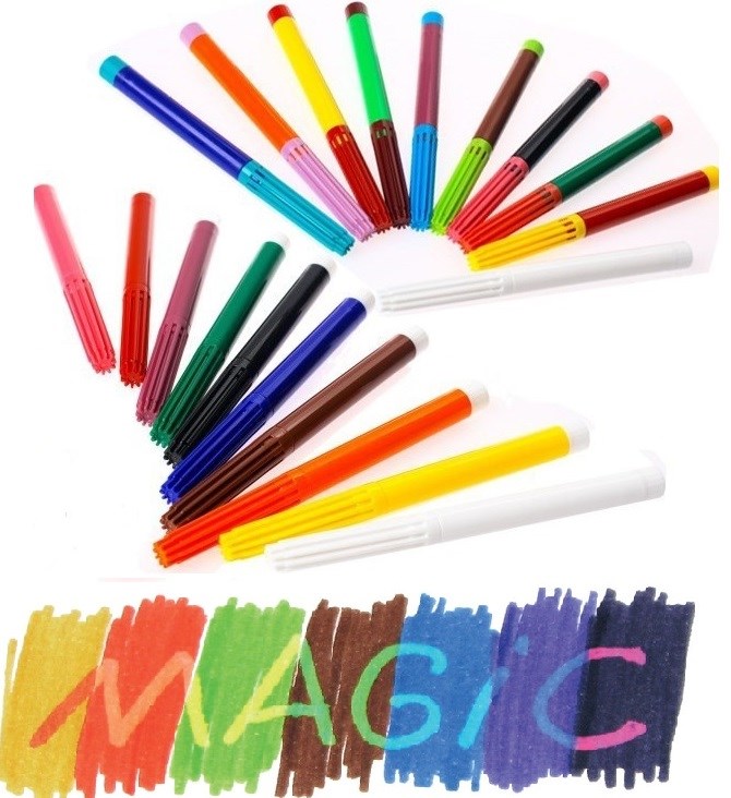 Волшебные фломастеры Magic Pens – набор состоит из 18 цветных фломастеров и 2-х фломастеров белого цвета, которые используются в качестве проявителя для изменения цвета. Корпус выкрашен в цвет, который отображает конкретный фломастер, колпачок же имеет тот оттенок, который должен появиться после использования проявителя.