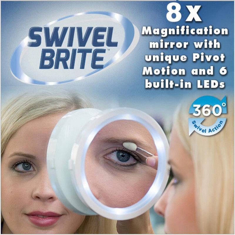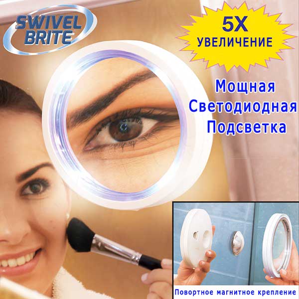 Зеркало с увеличением и подсветкой Swivel Brite – увеличительное зеркало с LED-подсветкой необходимая вещь в доме для женщин и мужчин. Поможет качественно провести любые косметические процедуры. С ним гораздо удобнее наносить макияж, избавляться от нежелательных волос, надевать контактные линзы. Зеркало с увеличением и подсветкой можно брать с собой куда угодно. После отсоединения от подставки, миниатюрное зеркало помещается, практически, в любую женскую сумочку.
