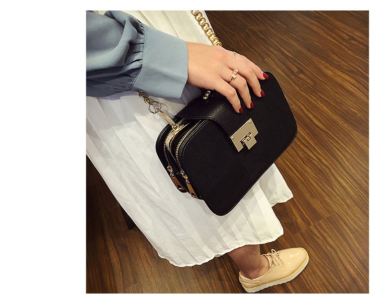 Удобная сумочка на цепочке с тремя отделениями и металлической пряжкой.