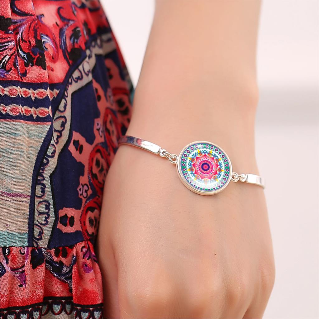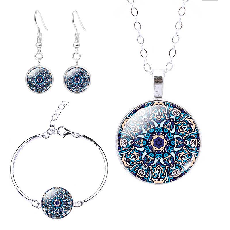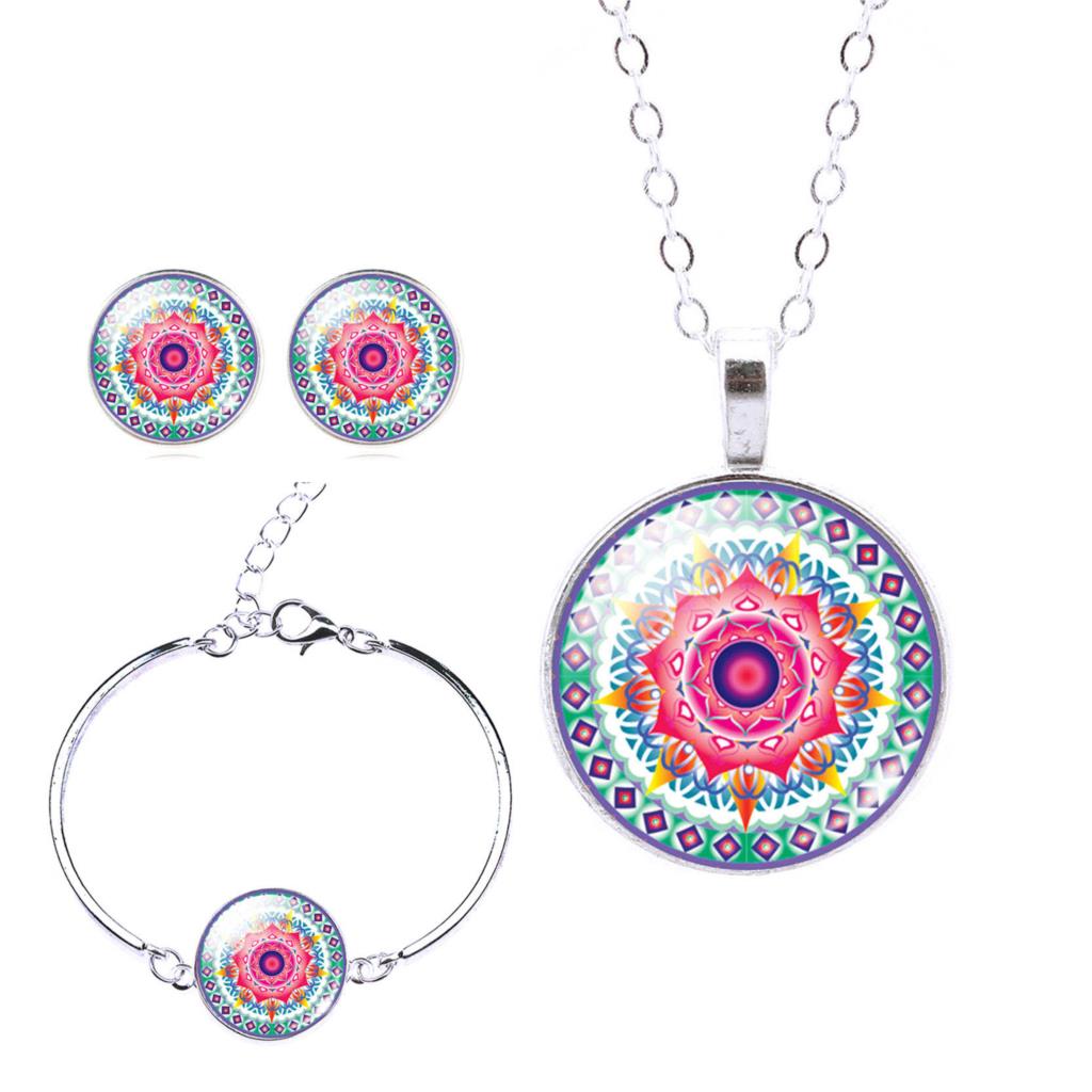 Набор с посеребренным покрытием, состоит из цепочки с кулоном, сережек-гвоздиков (или серьги крючком) и браслета с различными изображениями Мандалы - цветка жизни.