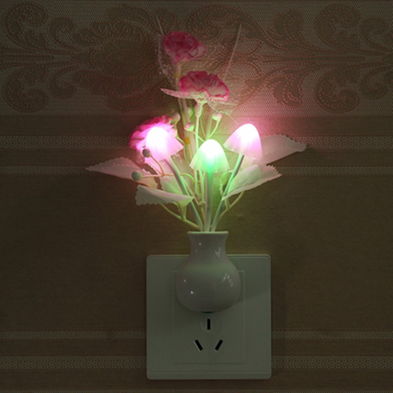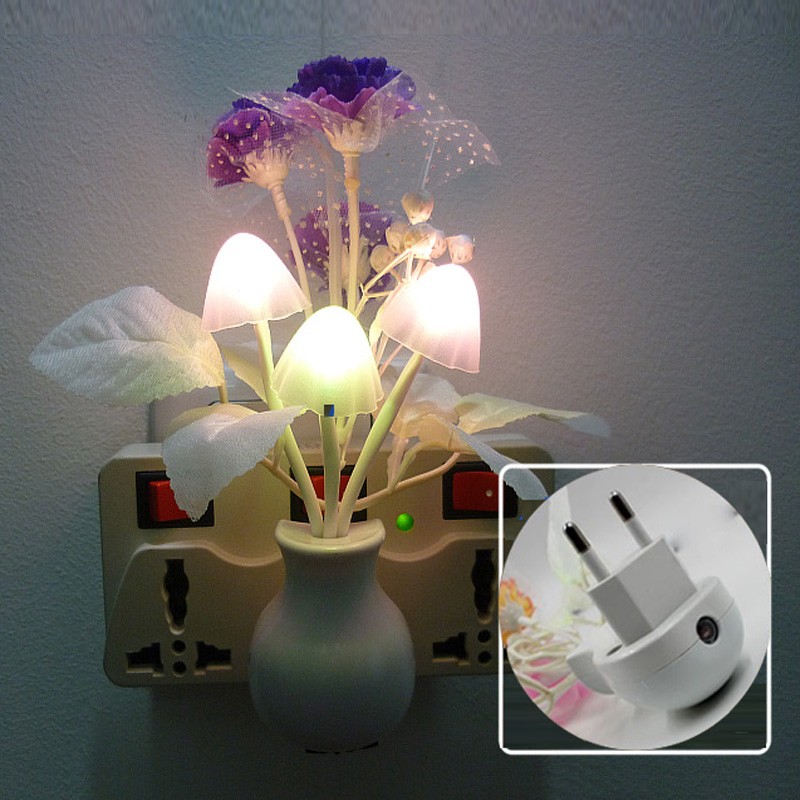 Маленький светильник-ночник с Алиэкспресс в виде вазочки с грибами и цветами. Работает от сети (включается в розетку). Имеет датчик освещения - при выключении света в помещении грибы горят огнями. Светодиоды многоцветные, поэтому грибы меняют цвет в темноте.