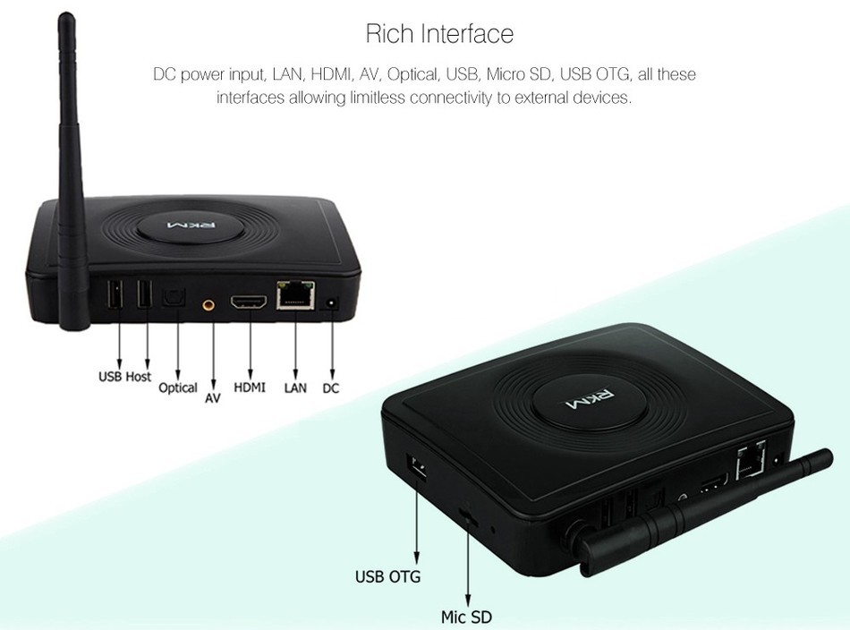 Интерфейс: А. В., DC Порт Питания, HDMI, Micro SD Слот Для Карт, OTG, RJ45, SPDIF, USB2.0